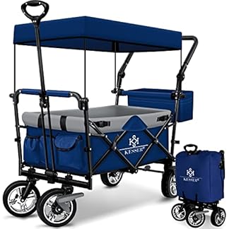 KESSER® Bollerwagen faltbar GT9000 mit Dach Handwagen Transportwagen | inkl. 2X 3-Punkt Gurtsystem| klappbar | Vollgummi-Reifen | bis 80 kg | Vorder- und Hinter-Bremse + Tragetasche, Blau/Grau