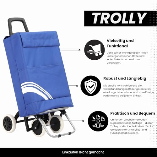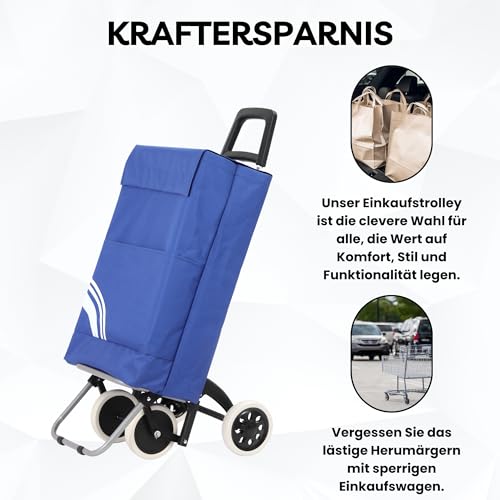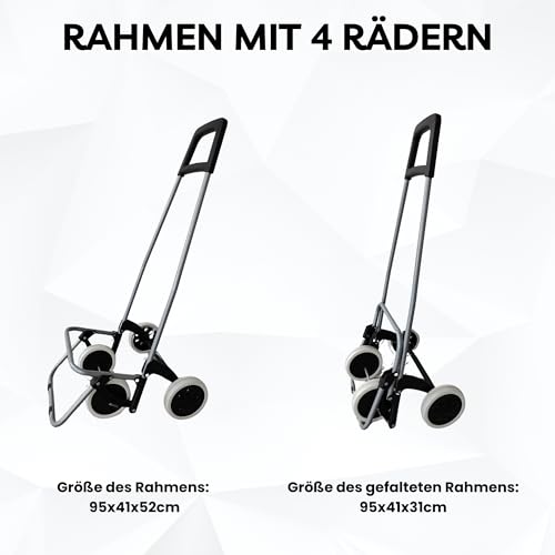 🛒4 Rollen – Ausgestattet mit robusten und großen Rollen, erleichtert dieser Shopping Trolley das Ziehen und Manövrieren selbst auf unebenen Böden. Die Rollen sind besonders langlebig und ermöglichen eine reibungslose Fortbewegung, ohne den Trolley heben zu müssen, was Rücken und Gelenke schont. Selbst beim Treppensteigen!