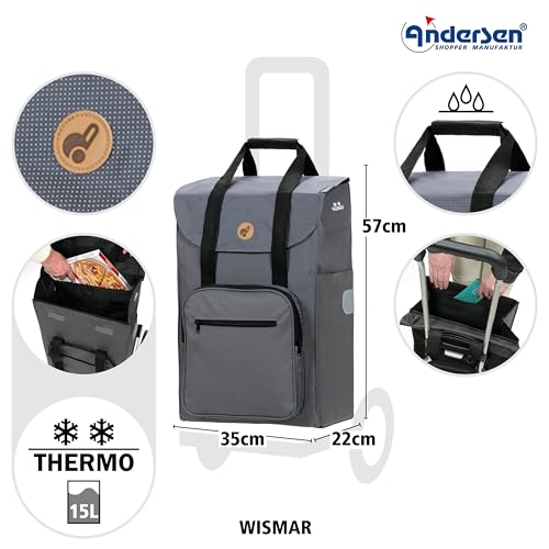 Andersen Einkaufstrolley Ersatztasche – 45 Liter – mit Kühlfach – Seiten- & Fronttasche – Tragegriff – extra Innenfach – Klettverschluss – wasserabweisend – Reflektoren – faltbar – Wismar Silbergrau