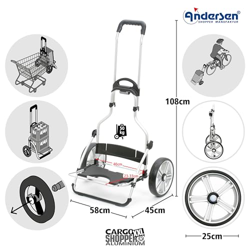 Fahrgestell – großes, robustes und leichtes Fahrgestell aus Aluminium mit breiter Ladefläche, klein zusammenlegbar, Ladefläche vergrößerbar, Einkaufswagen-Befestigung, Tragegriff, Tragkraft 50 kg, Spurbreite 58 cm