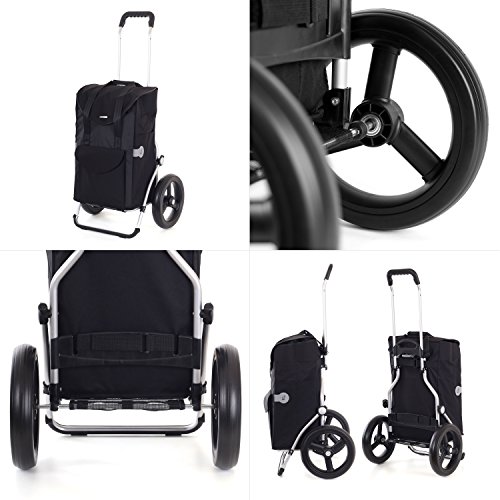 Tasche aushängen – leer einfach. Abstufen, Absätze mit den großen Rädern – kein Problem. Trunken bepackt – easy durch die Kugellager. Dazu die an-den-Einkaufswagen-hänge-Haken – einfach praktisch!