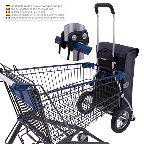 Tasche aushängen – leer einfach. Spezifizieren, Absätze mit den großen Rädern – kein Problem. Bügel für Kisten & einzeln Fronttasche – praktisch. Dazu die an-den-Einkaufswagen-hänge-Haken – einfach genial!