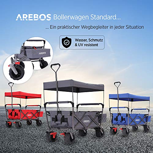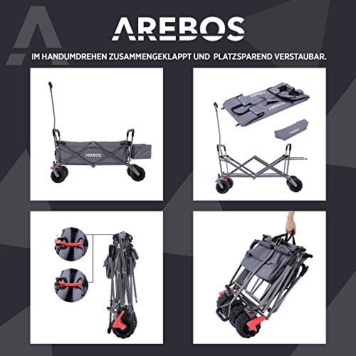 Arebos Bollerwagen faltbar mit Dach | Handwagen | Transportkarre Gerätewagen inkl. 2 Netztaschen und Einer Außentasche | Vorderrad-Bremse | klappbar | Vollgummi-Reifen | bis 100 kg Tragkraft | Grau
