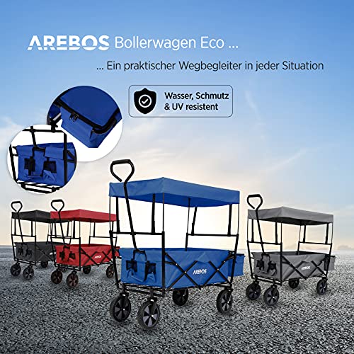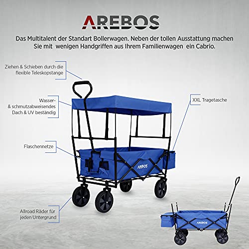 Arebos Bollerwagen faltbar mit Dach | Handwagen | Transportwagen | Faltwagen | Gerätewagen inkl. 2 Netztaschen und Einer Außentasche | faltbar | bis 70 kg Tragkraft | 360° Vollgummireifen | Blau