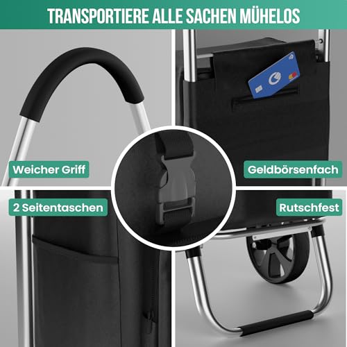 Der Einkaufstrolley besteht aus leichtem Aluminium und 600D Polyester. Dies sind robuste Materialien, die nicht rosten oder abnutzen. Der Einkaufstrolley von GLÄNZ kann viel Gewicht tragen, nämlich bis zu etwa 45 kg. Auch ist es leicht zu reinigen, wasserabweisend und abriebfest. Zusätzlich ist der Hartschalenkorb für Einkäufe mit robusten geräuschlosen Rädern mit rutschfestem Design ausgestattet.