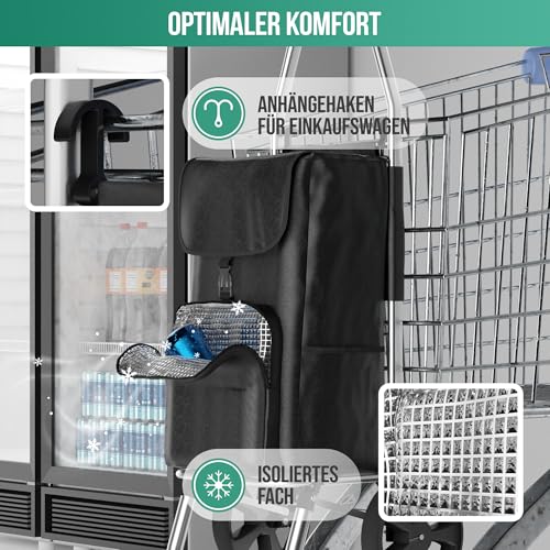 Was an diesem angesagten Einkaufstrolley sehr ideal ist, ist, dass Sie durch die praktischen Haken den Wagen am Einkaufswagen aufhängen können. So müssen Sie nicht mit einem Wagen und Trolley laufen und können die Einkäufe einfach in einer feinen Höhe in den Einkaufswagen platzieren. Das Packen eines Wagens war noch zu keiner Zeit so einfach!