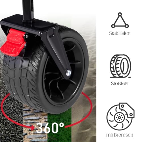 👍【ALLE GELÄNDE BREITE RÄDER MIT BREMSEN】Die Räder bestehen aus hochwertigem PVC-Material, das strapazierfähig und um 360° schwenkbar ist. Dank der Bremskonstruktion können Sie den Wagen auch an Hängen verwenden, ohne sich Sorgen machen zu müssen, dass sich die Räder von selbst bewegen. Die breiten All-Terrain-Räder eignen sich für ein breites Spektrum an Terrains, einschließlich Sandstränden, Grasflächen und flachem Boden, und machen es für Familien einfach, sich zu bewegen.
