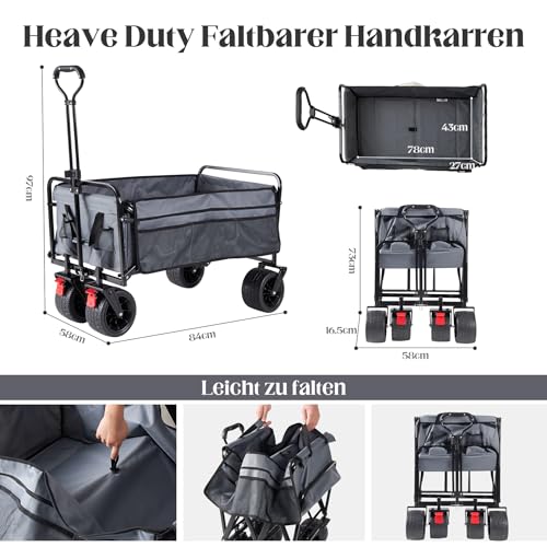 BedStory Bollerwagen Faltbar mit Bremsen | Transportwagen klappbar bis 80 kg Tragkraft | Camping Strand Offroad Bollerwagen Alle Gelände Breite Räder Teleskopstange, Grau