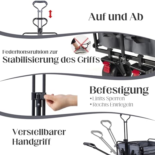 👍【HOHE QUALITÄT & HOHE LEISTUNG】Die Höhe des bollerwagen ist verstellbar. Ein integrierter Federmechanismus unterhalb des Griffs verhindert, dass der Griff unkontrolliert zu Boden fällt.2 Becherfächer zur Aufbewahrung von Bechern, Getränkeflaschen, Regenschirmen etc. Seitliche Netztaschen zur Aufbewahrung von Lieferscheinen und anderen Gegenständen usw. Der Trolley ist allesamt 600D Oxford-Gewebe gefertigt, das reiß- und schmutzfest ist.