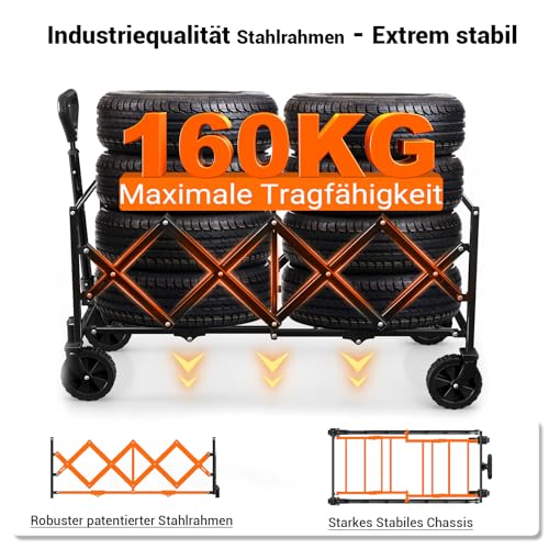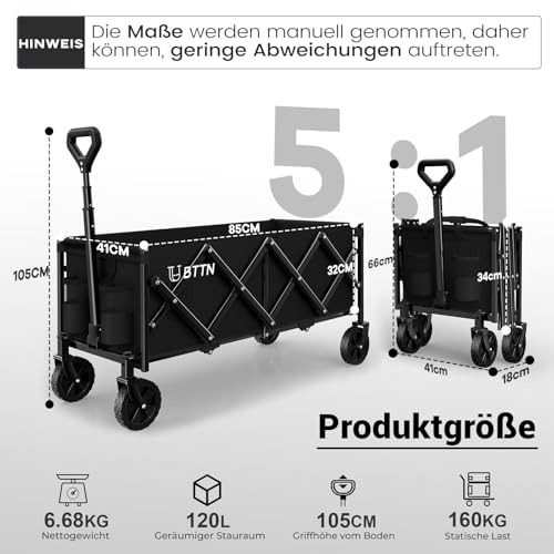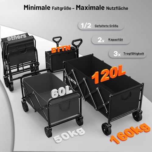 BTTN 120L Klappbarer Bollerwagen, 160kg (350LBS) Traglast Handwagen Faltbar mit Leisen Rädern, Bollerwagen für Garten, Camping, Einkaufen & Picknick, Faltbar Transportwagen mit Stabil Rädern, Schwarz