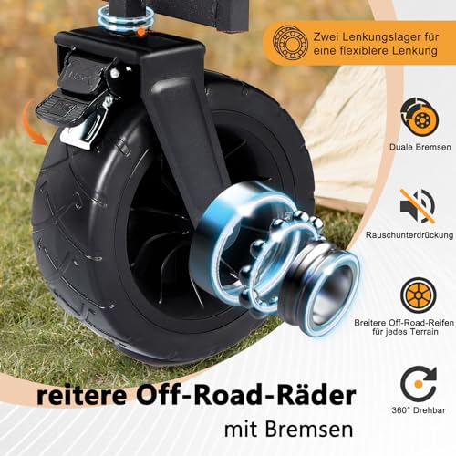 Einzigartiges Radachsendesign:Century Star Bollerwagen Die Achsen der Räder sind schwenkbar, so dass Sie den Kinderwagen bei 360°-Drehungen steuern können. Die Räder haben rutschfeste Aufdrucke, und die Breite der Räder von 19 cm ermöglicht eine reibungslose Fahrt an Stränden, auf Grasflächen und allen Arten von komplizierten Oberflächen, und die Bremsbeläge umsorgen Sicherheit in allen Situationen.