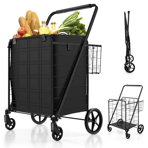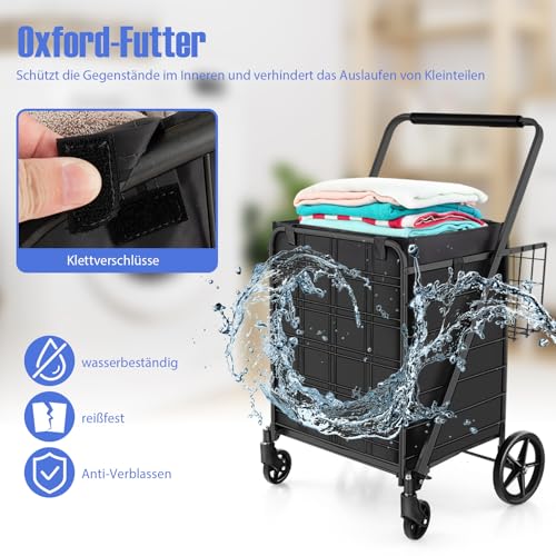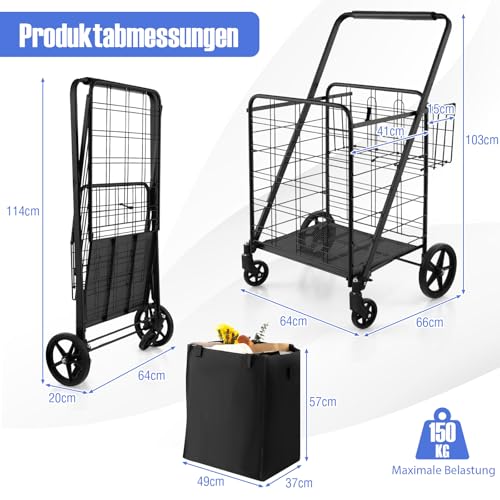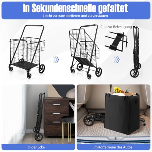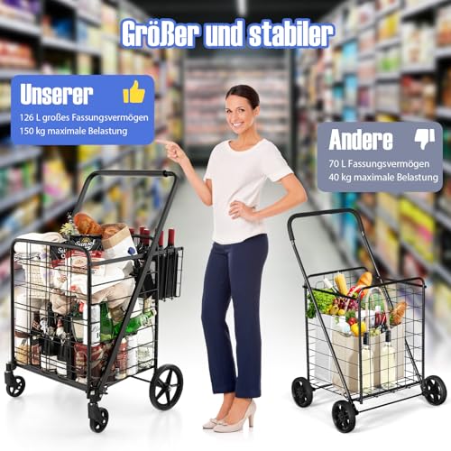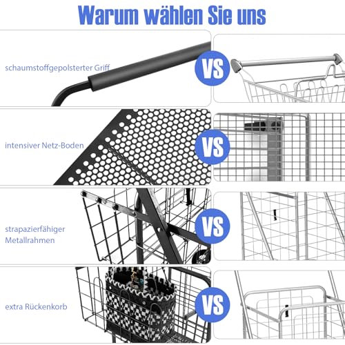 【Robuste Konstruktion mit dichterer Basis】Der Einkaufswagen mit robuster Metallkonstruktion ist hart im Nehmen und langlebig. Er trägt problemlos bis zu 150 kg Gewicht. Noch wichtiger ist, dass der Boden des großen Korbs aus einem dichteren Netzgewebe besteht, das effektiv verhindert, dass kleine Gegenstände herunterfallen.