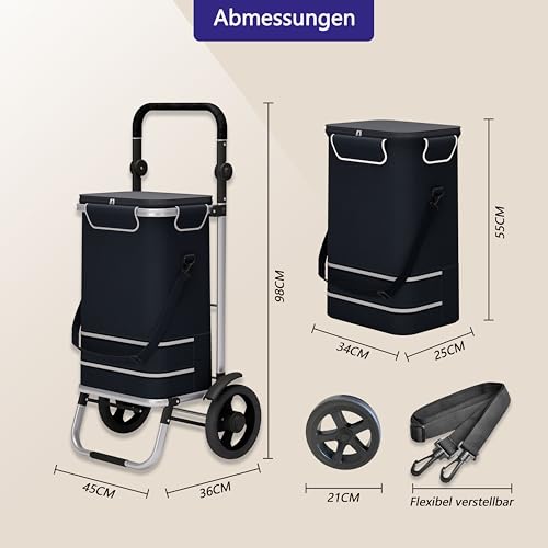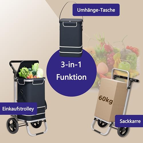Einkaufen leicht gemacht mit 3-in-1 Abdruck: Mit dem Einkaufstrolley ist es ein einfaches den wöchentlichen Großeinkauf zu ad acta legen. Der Einkaufs Trolley kann gezogen werden, als Einkaufstasche über die Schulter gehangen werden und das Gerüst als Sackkarre verwendet werden.