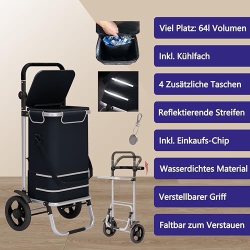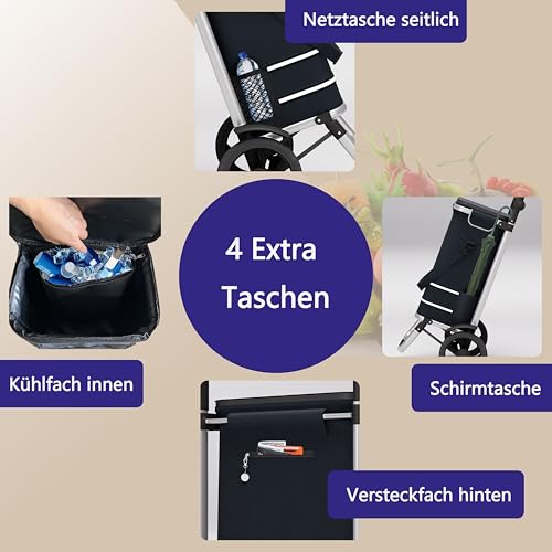 Kühlfach und einzig Taschen: Der Einkaufswagen hat ein integriertes Kühlfach z.B. für Fleisch, Milch- und Tiefkühlprodukte. Zusätzlich gibt es außen eine Schirm- und Netztasche. Auf der Abseite gibt es eine sichere Tasche z.B. für den Geldbeutel. Mitgeliefert wird ein Chip zum Auslösen von Supermarkt Einkaufswägen.