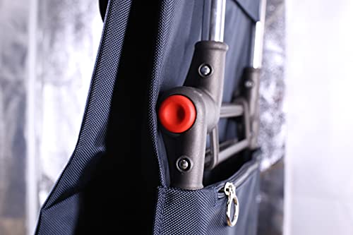 Vier faltbare Räder, starke Fronthalterung für einfaches Verteilen und Transportieren von Gewicht, Innentaschen für Geldbeutel.