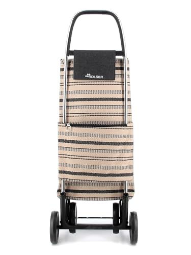 Einkaufstrolley Rolser jedweder Leichtmetall mit 2/4 Rädern, der das Abschleppen von schweren Einkäufen erspart. Die Position mit zwei Rädern wird zum Hinterziehen des Einkaufstrolleys im leeren Zustand und die Position mit vier Rädern zum Schieben im beladenen Zustand empfohlen.