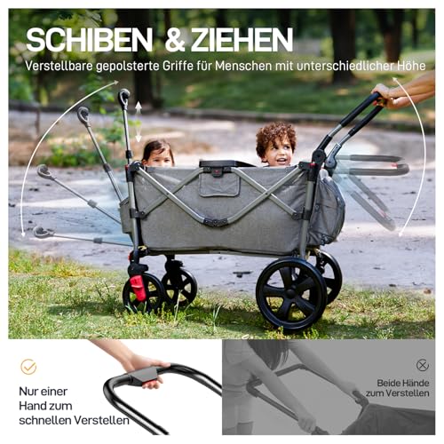 【Ziehen & Schieben】Dieser faltbare Kinderwagenwagen verfügt über flexibler Ziehgriff und Schiebegriff, deren Höhe leicht verstellbar ist. Es ist ideal für Kindertransport und kann aufgrund des überlegenen Designs aka Ware transportieren. Zum Verstauen kann dieser Wagen auf eine kompakte Größe gefaltet und in Schrank, Rumpelkammer, Kofferraum aufbewahrt werden.