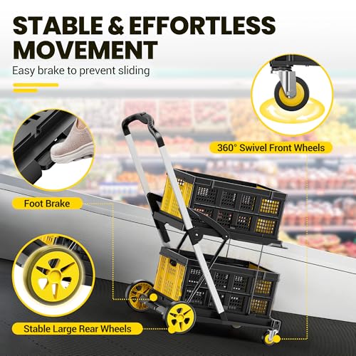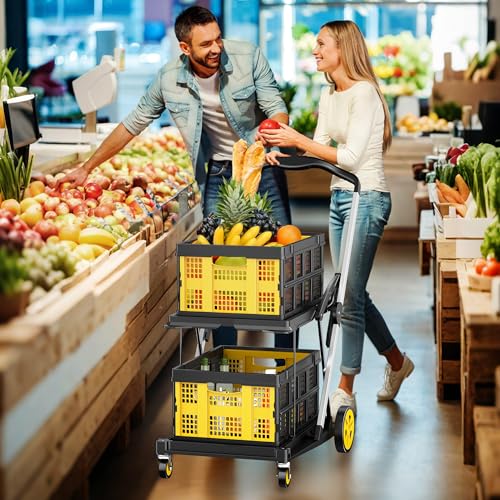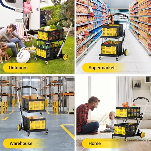 Faltbarer Einkaufswagen, 8-in-1, 90,7 kg, multifunktionaler Mehrzweckwagen mit 2 Aufbewahrungskisten, verstellbarer Griff, Lebensmittelwagen auf Rädern für Einkaufen/Lager/Büro/Supermarkt, Gelb