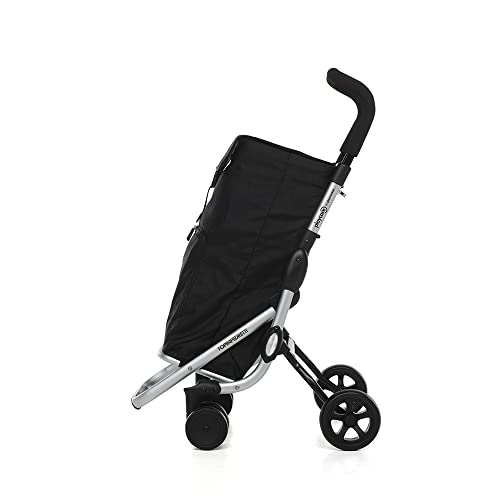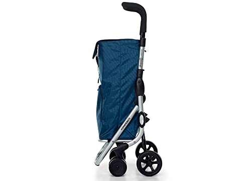 Leichter und leicht schließbarer Einkaufswagen, ausgestattet mit geräumiger Tasche mit Reißverschlussfach unten und abnehmbarem oberen Fach.