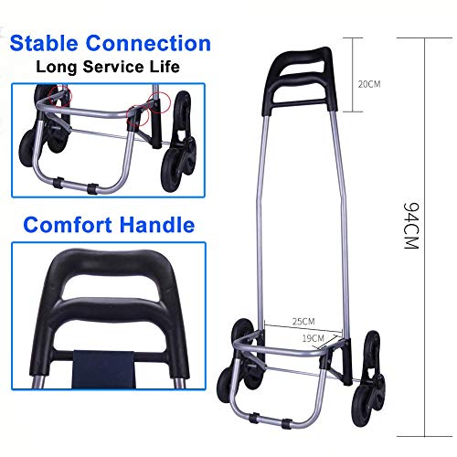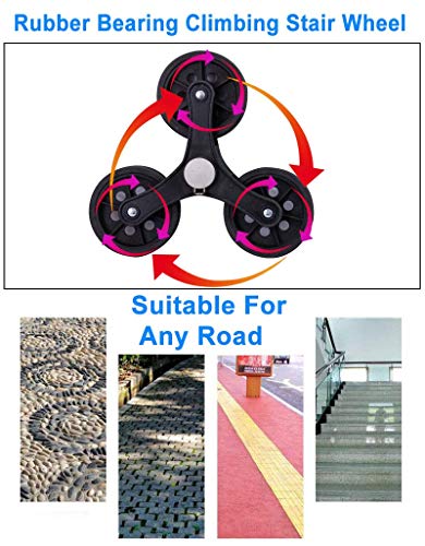 Übergroße Reifen – Drei Räder speziell für Treppensteigen entwickelt, 360° drehbare Vorderräder, können die Richtungen reibungslos tauschen; die übergroßen Hinterräder können nach oben, unten, Bordsteinkanten oder unebenen Wegen konzertiert werden, einfach zu verwalten auch auf unebenen Oberflächen und Abstufen; die Verwendung von verschleißfestem Gummi-Rad, weniger Lärm, Gehaufwand.