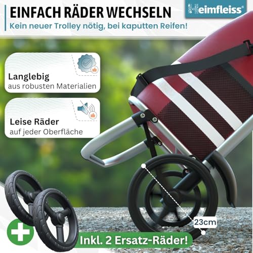 𝗜𝗻𝗸𝗹𝘂𝘀𝗶𝘃𝗲 𝗘𝗿𝘀𝗮𝘁𝘇𝗿ä𝗱𝗲𝗿 – Dank der mitgelieferten Ersatzräder ist kein direkter Neukauf notwendig – einfach die Räder austauschen! Durch die extragroßen Räder ist der Einkaufswagen Trolley allerbest leise und für verschiedenste Untergründe passend, ohne schnell kaputtzugehen.