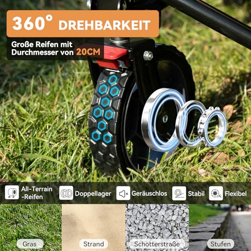 360° WENDIGKEIT, 100% KONTROLLE – Egal ob auf Schotterwegen, nassem Gras, Sand oder Waldboden, meistern die robusten Reifen unseres Einkaufstrolleys jedes Terrain mit Leichtigkeit. Dank der 360°-Vorderräder lässt er sich spielend leicht manövrieren, Sintemal die integrierten Abmildern für zuverlässigen Halt auf abschüssigem Gelände sorgen. So kommen Sie leistungsfähig ans Beendigung – Bekannt als mit voller Beladung.