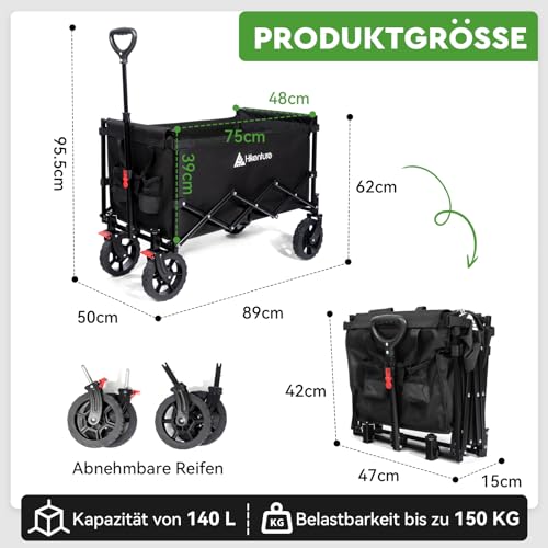 HIKENTURE Bollerwagen Faltbar mit Bremen – 140 Liter Volumen & 150KG belastbar – Extrem Faltbarer Bollerwagen – Klappbarer Handwagen Einkaufstrolley für Strand Camping Einkauf