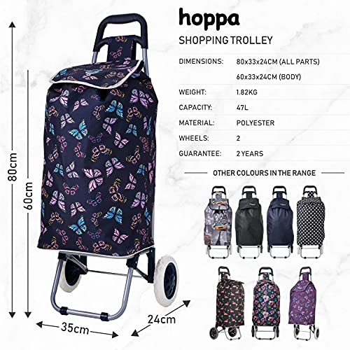 Hoppa Leichter Einkaufstrolley, 57 l, Modell 2024, strapazierfähig und zusammenklappbar für einfache Lagerung, marineblaue Schmetterlinge