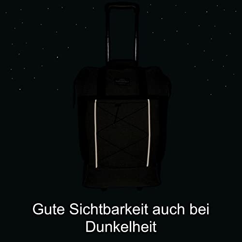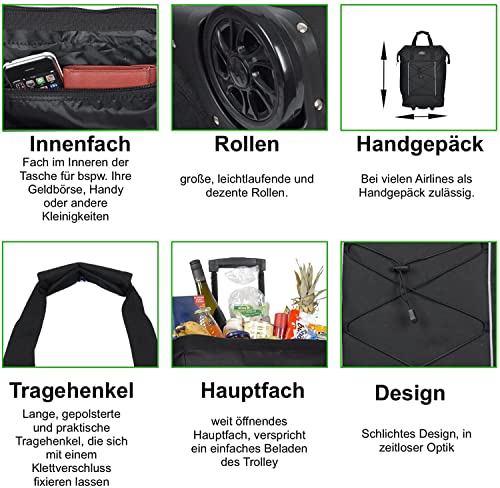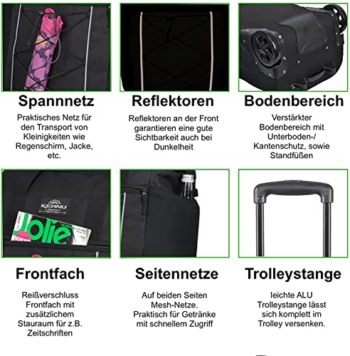Marke: Keanu Einkaufstrolley mit grossen Laufräder in verschiedenen Design Varianten – Optimal für den täglichen Einkauf, im Unterschied dazu auch für ins Fitness-Studio oder auf Reisen im Urlaub ( Sendung OHNE auf den Bildern gezeigtes Zubehör und Lebensmittel ) Artikelnummer: 10303 sehr hochwertige und ansprechende Optik im funktionalen Design, Aussenmasse: ca. 62 cm x 28 cm x 38 cm ( mit ausgefahrener Stange ca. 106 cm Höhe ab Boden ), Gewicht ca. 2700 Gramm, Volumen ca. 40 Liter ( Herstellerangabe ), Material: 100% Polyester ( Hang und wasser unnahbar – einfach mit feuchten Tuch und etwas Seifenlauge abwaschbar ) hochwertiges Aluminium Trolley-Gestänge mit DoubleTeleskop Stick und breitem Griff – Gestänge voll versenkbar ! Vordertasche mit Reissverschluss für Kleinigkeiten und / oder Autoschlüssel, Handy etc. Mit zusätzlichen Innenwertfach für z.B. Geldbörse, Smartphone weitöffnendes Hauptfach mit Reissverschluss für einfache und schnelle Beladung Ihres Einkaufs lange Tragehenkel mit Klettverschluss Fixierung – so können Sie den Trolley als „normale“ Tasche unterstützen stabiler Bodenbereich ( Abseitsstellung verstärkt ) mit Unterbodenschutz und Standfuss robuste – Abseitsstellung große Leichtlauf Rollen mit Kugellager sehen nach zuverlässiges und geräuscharmes rollen auf Asphalt Sendung OHNE Deko und Inhalt