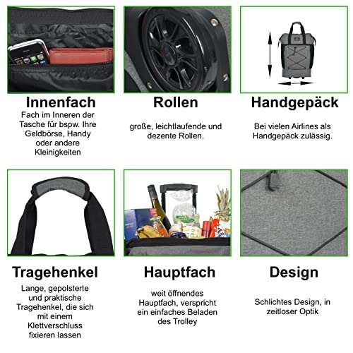 Marke: Keanu Einkaufstrolley mit grossen Laufräder in verschiedenen Design Varianten – Optimal für den täglichen Einkauf, doch auch für ins Fitness-Studio oder auf Reisen im Urlaub ( Ablieferung OHNE auf den Bildern gezeigtes Zubehör und Lebensmittel ) Artikelnummer: 10303 sehr hochwertige und ansprechende Optik im funktionalen Design, Aussenmasse: ca. 62 cm x 28 cm x 38 cm ( mit ausgefahrener Stange ca. 106 cm Höhe ab Boden ), Gewicht ca. 2700 Gramm, Volumen ca. 40 Liter ( Herstellerangabe ), Material: 100% Polyester ( Sinken und wasser distanziert – einfach mit feuchten Tuch und etwas Seifenlauge abwaschbar ) hochwertiges Aluminium Trolley-Gestänge mit DoubleTeleskop Stick und breitem Griff – Gestänge voll versenkbar ! Vordertasche mit Reissverschluss für Kleinigkeiten und / oder Autoschlüssel, Handy etc. Mit zusätzlichen Innenwertfach für z.B. Geldbörse, Smartphone weitöffnendes Hauptfach mit Reissverschluss für einfache und schnelle Beladung Ihres Einkaufs lange Tragehenkel mit Klettverschluss Fixierung – so können Sie den Trolley als „normale“ Tasche versteifen stabiler Bodenbereich ( einzig verstärkt ) mit Unterbodenschutz und Standfuss robuste – einzig große Leichtlauf Rollen mit Kugellager umsorgen zuverlässiges und geräuscharmes rollen auf Asphalt Ablieferung OHNE Deko und Inhalt