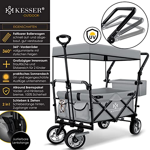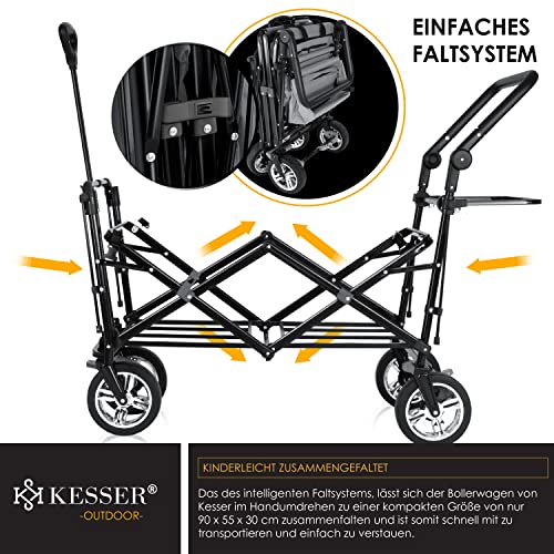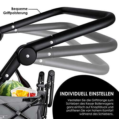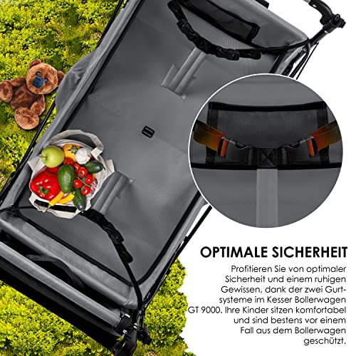 𝐕𝐈𝐄𝐋𝐒𝐄𝐈𝐓𝐈𝐆𝐄 𝐀𝐔𝐒𝐒𝐓𝐀𝐓𝐓𝐔𝐍𝐆: Neben der integrierten, XXL Tasche am Heck und und diversen Aufbewahrungstaschen, ist der GT-9000 Bollerwagen mit zwei Griffen zum Ziehen oder Schieben, sowie 360° drehbaren Rädern und Abmildern versehen.