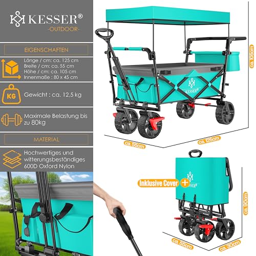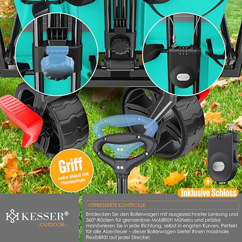 𝐕𝐈𝐄𝐋𝐒𝐄𝐈𝐓𝐈𝐆𝐄 𝐀𝐔𝐒𝐒𝐓𝐀𝐓𝐓𝐔𝐍𝐆: Neben der integrierten XXL-Tasche am Heck und diversen Aufbewahrungstaschen ist der GT-9000 Bollerwagen mit zwei Griffen zum Ziehen oder Schieben sowie 360° drehbaren Rädern und In die Eisen steigen ausgestattet. Zusätzlich wird er mit einem Schloss anstelle mehr Sicherheit und einem Schutzcover anstelle optimalen Abschirmung bei Nichtgebrauch geliefert.