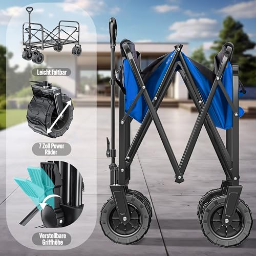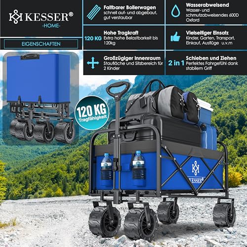 KESSER® Bollerwagen faltbar mit Breite Reifen Handwagen Transportkarre Gerätewagen, inkl. 2 Netztaschen & Seitentasche | klappbar | Vollgummi-Reifen | Transportwagen Gartenanhänger, Blau/Grau