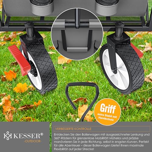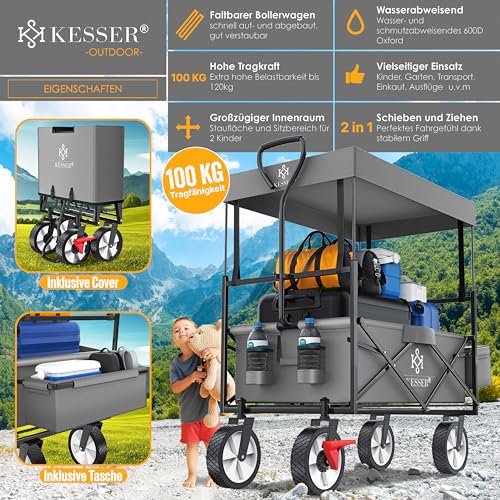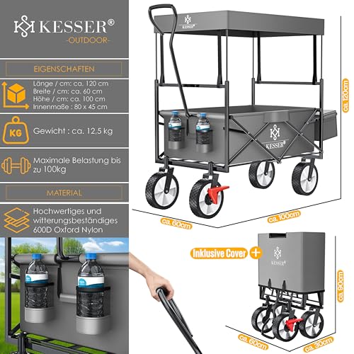 KESSER® Bollerwagen faltbar mit Dach Handwagen Transportkarre Gerätewagen inkl. 2 Netztaschen, Cover und Einer Außentasche Mit Vorderrad-Bremse | klappbar | Vollgummi-Reifen | bis 100 kg Tragkraft