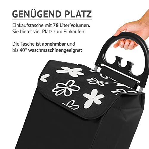 Kiley Einkaufstrolley XXL schwarz mit Blumendesign & großen Rädern – Einkaufswagen klappbar bis 50kg belastbar 78 Liter…