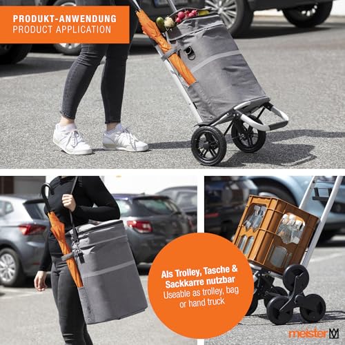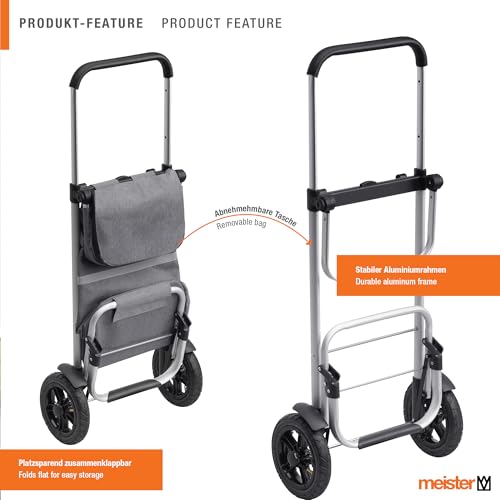 DURCHDACHTE FEATURES: Dreifach höhenverstellbarer Teleskopgriff ist einfach per Knopfdruck verstellbar | Integrierte Halterung zum Aufhängen am Einkaufswagen | Gestell alias qua Sackkarre nutzbar | Platzsparend zusammenfaltbar