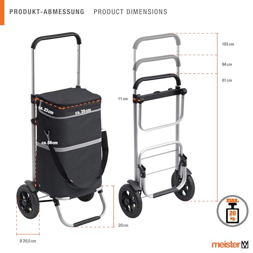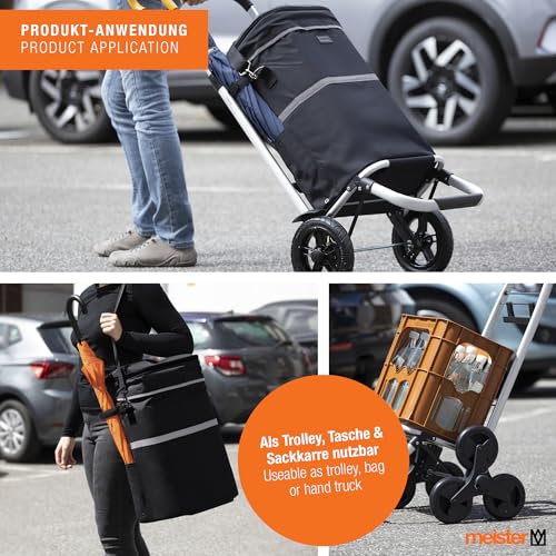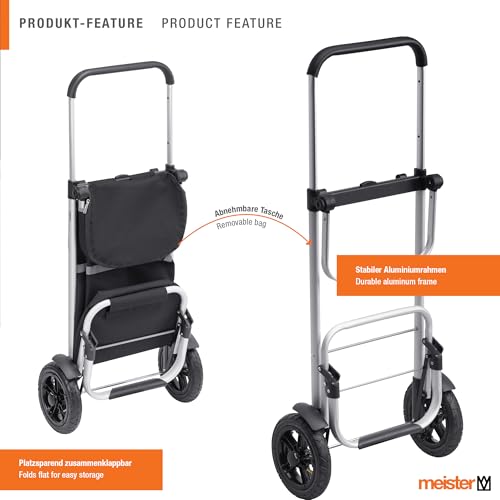 DURCHDACHTE FEATURES: Dreifach höhenverstellbarer Teleskopgriff ist einfach per Knopfdruck verstellbar | Integrierte Halterung zum Aufhängen am Einkaufswagen | Gestell vulgo qua Sackkarre nutzbar | Platzsparend zusammenfaltbar