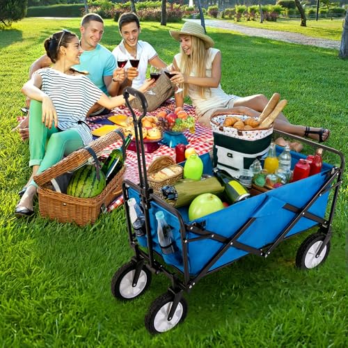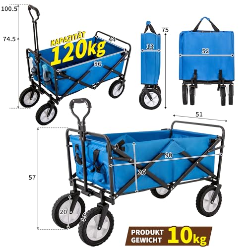 Merax Bollerwagen Faltbar Handwagen mit verstellbare Griffe, Gartenwagen Transportwagen mit Getränkehalter, Strandwagen Picknickwagen für Alle Gelände, 360°-Rotation des Vorderrads, bis 120kg, Blau