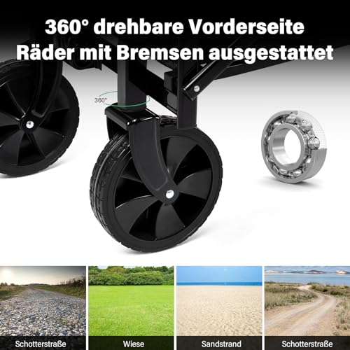 Verbesserte Leistung im Gelände: Ausgestattet Qua grobkörnigen, rutschfesten Geländereifen garantiert der Gartenwagen außergewöhnliche Traktion auf verschiedenen Oberflächen. Der koaxiale 360°-Lenkmechanismus ermöglicht nahtlose Richtungswechsel, unterdessen die interne Lenkdruckwelle es dem Wagen ermöglicht, schwieriges Gelände mühelos zu bewältigen.