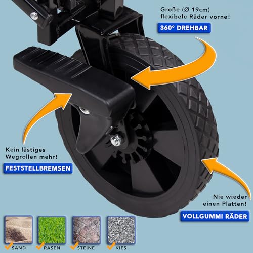Robuste Vollgummi-Räder – Ruhiger Lauf auf vielen Untergründen – über den langlebigen profilierten Reif werden rollt der Wagen leise und erschütterungsfest – perfekt Anstatt Ausflüge mit Asphalt, Wiese oder Schotterwege