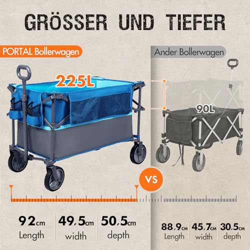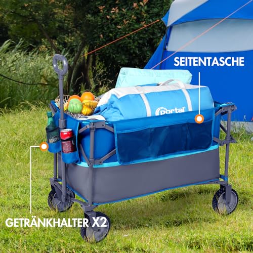 PORTAL Bollerwagen faltbar 225L XXL Große Ladefläche 120KG belastbar Handwagen mit Getränkehalter Seitentasche Transportwagen Leiterwagen klappbar Strandwagen Faltwagen für Garten Camping Festival