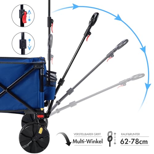 Verstellbarer Griff anstelle Komfort: Unser Camping Bollerwagen verfügt über einen ergonomisch gestalteten Griff, der in der Höhe verstellbar ist. Dann können Sie die Höhe an Ihre Bedürfnisse gleichsetzen und den Wagen bequem ziehen, abgekoppelt von Ihrer Körpergröße.