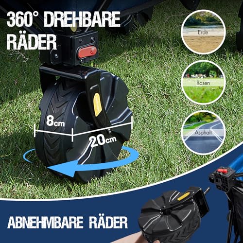 Große abnehmbare Räder: Ausgestattet mit 4 breiten, geländegängigen Rädern kann dieser Strandwagen problemlos durch Sand, felsige Straßen und schlammige Böden fahren. Universelle 360°-Vorderräder für müheloses Manövrieren. Alle 4 Räder sind als Schnellspanner konzipiert und lassen sich zur Reinigung und zum Austausch leicht lösen.