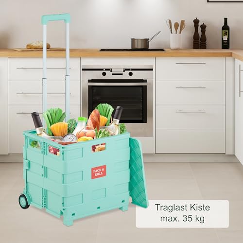 Einkaufen: Türkiser Transporttrolley ist ideal für stressfreien Einkauf – Deckel schützt den Inhalt