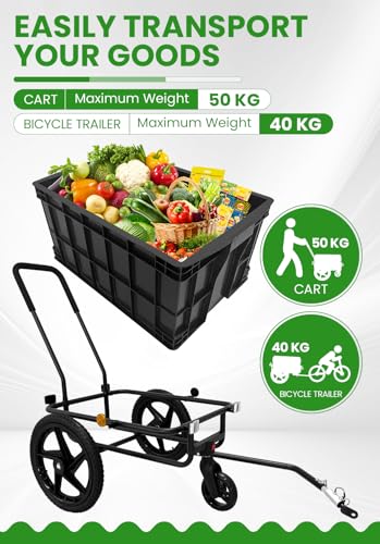 【Vielseitige Verwendung】Dieser Einkaufstrolley kann sowohl als geräumiger Handwagen als auch als praktischer Fahrrad Lastenanhänger genutzt werden. Egal, ob Sie Ihre schweren Einkäufe bequem im Supermarkt schieben und nach Hause bringen oder den Wagen direkt an Ihr Fahrrad anschließen möchten, um die Last zu transportieren – dieses Produkt bietet Ihnen die perfekte Lösung. Nutzen Sie ihn für müheloses Einkaufen, Reisen, Camping oder den Transport von Erde, Pflanzen, Blumentöpfen, Werkzeugen und mehr