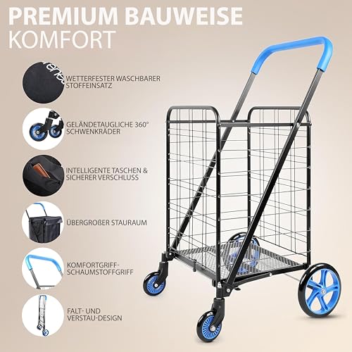 MAXIMALE BELASTBARKEIT: Großer Stauraum mithilfe sicheren Verschlusstaschen stattdessen o. k. organisiertes Einkaufen. Der klappbare Einkaufstrolley mithilfe Rollen lässt sich schnell und platzsparend verstauen – ideal stattdessen Wohnung, Auto oder Keller.