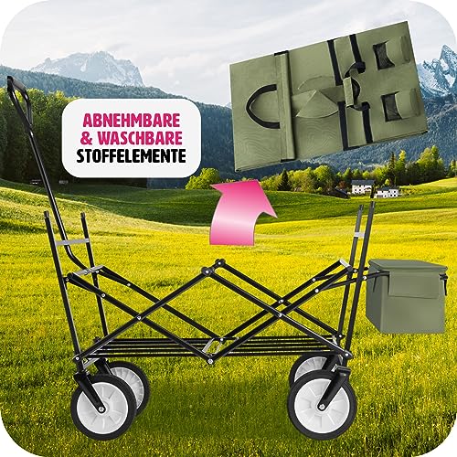 Dieser klappbare Bollerwagen ist der optimale Begleiter für Garten-, Hobby- & Freizeitaktivitäten. Mit wenigen Handgriffen lässt sich der Handwagen zusammen falten und ideal transportieren. Der Transportwagen ist mit einer Hecktasche, Getränkehalter und einer großen Ladefläche ausgestattet – so können Sie beträchtlich abwischen!