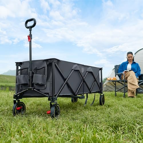 Starke Traktion: Der Trolley besteht jeglicher einer X-förmigen Stahlstruktur und einem 500D*300D-Polyestergewebe, das wahnsinnig und langlebig ist, mit einer Tragfähigkeit von bis zu 160 kg, was für eine Vielfalt von Szenarien angebracht ist, wie Einkaufen, Transport, Camping, Picknick, Angeln und so weiter.
