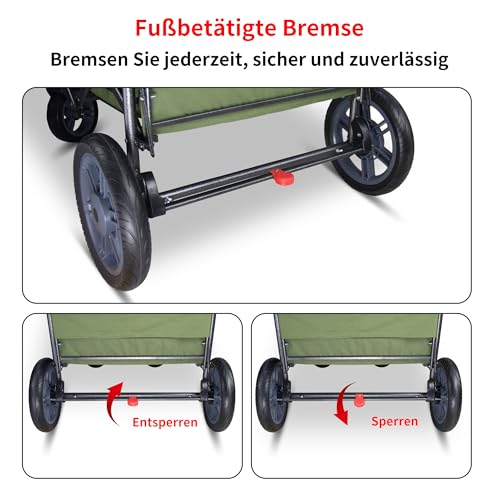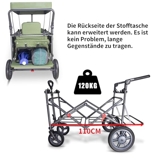 TMZ Bollerwagen Faltbar mit Dach Handwagen Transportwagen mit Ziehen & Schieben, Fußbremse Tragfähigkeit 120 kg für Alle Gelände Camping Strand Einkaufen(grün)