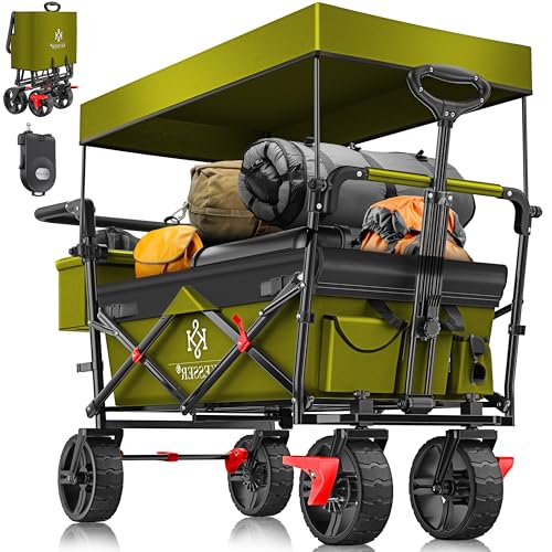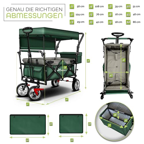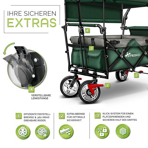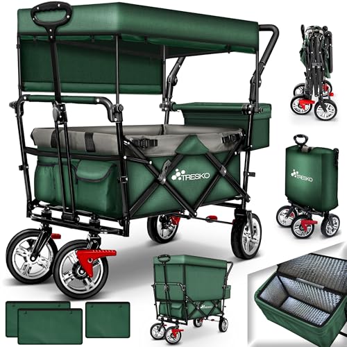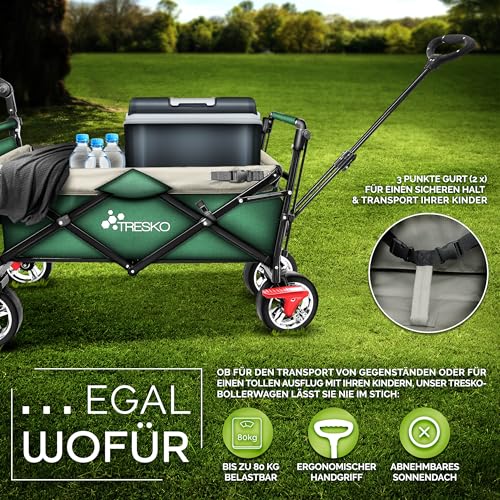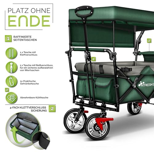 TRESKO Bollerwagen faltbar mit Dach, Kühltasche & Seitenrollos | Handwagen mit 3-Punkt Gurtsystem | Gartenwagen klappbar | Transportwagen mit Vollgummi-Reifen + Bremse + Tragetasche (Grün)